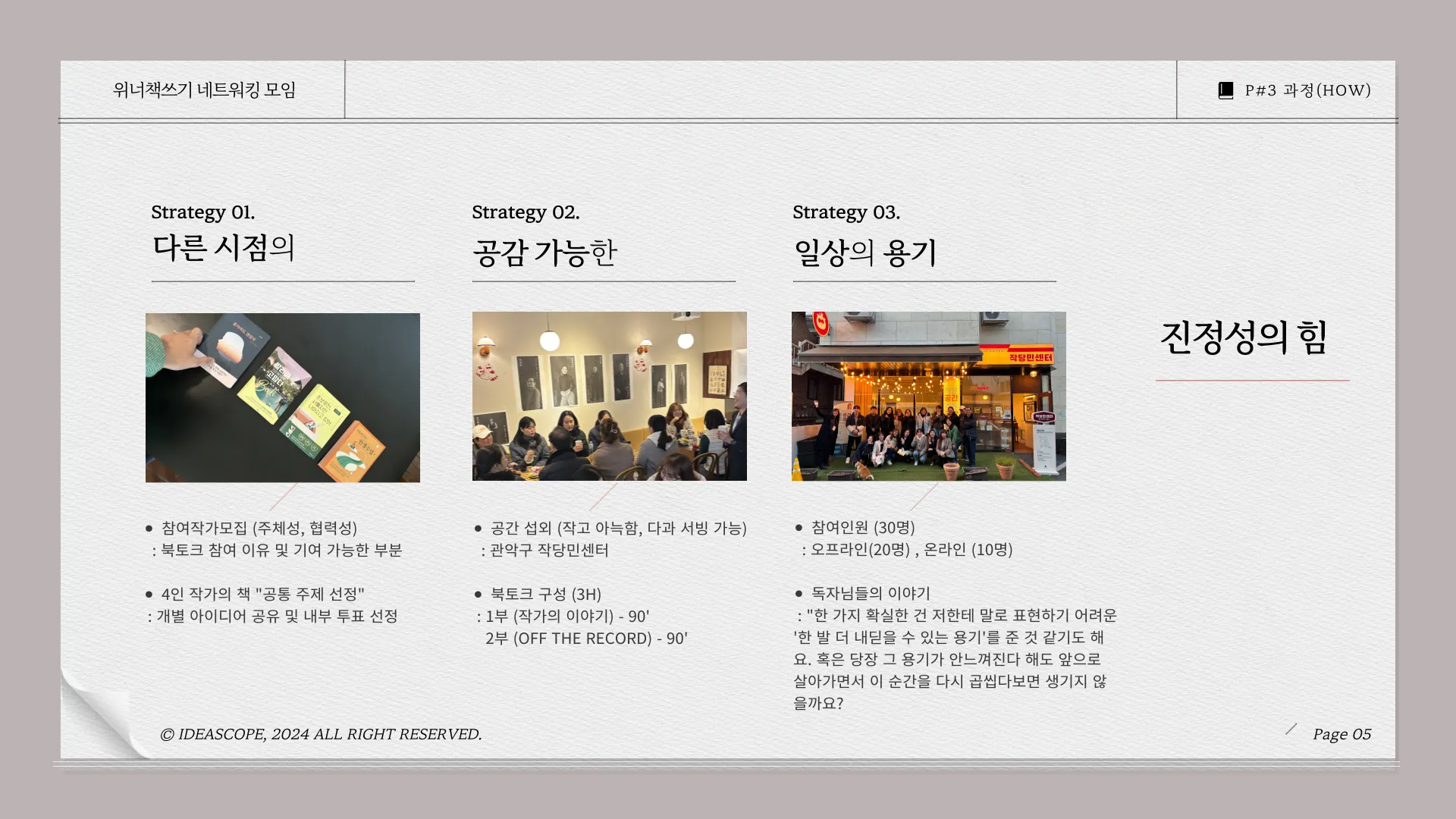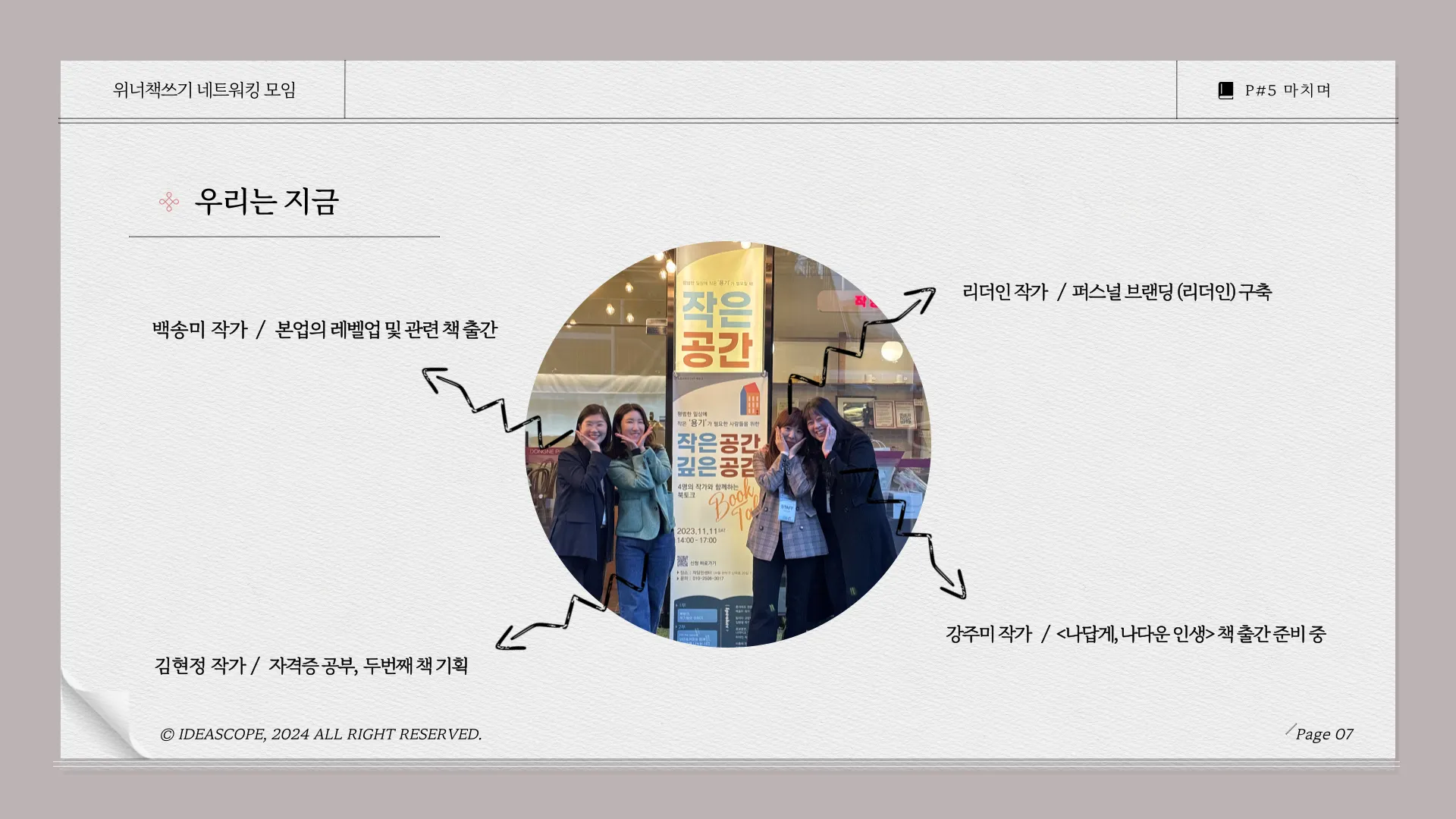 그 아쉬움을 덜기 위해, 동기 작가들과 함께 <작은 공간, 깊은 공감>이라는 북토크를 직접 기획하고 운영했습니다. 보통 북토크는 누군가에 의해 준비된 행사에서 가볍게 책을 소개하는 자리로 끝나는 경우가 많습니다. 하지만 이번에는 처음부터 끝까지 작가들이 주도하여, “행사기획 → 운영 → 사후관리”의 모든 과정을 함께 했습니다. 그 결과, 단순히 개인 브랜딩을 넘어선 더 큰 성과를 얻을 수 있었습니다.