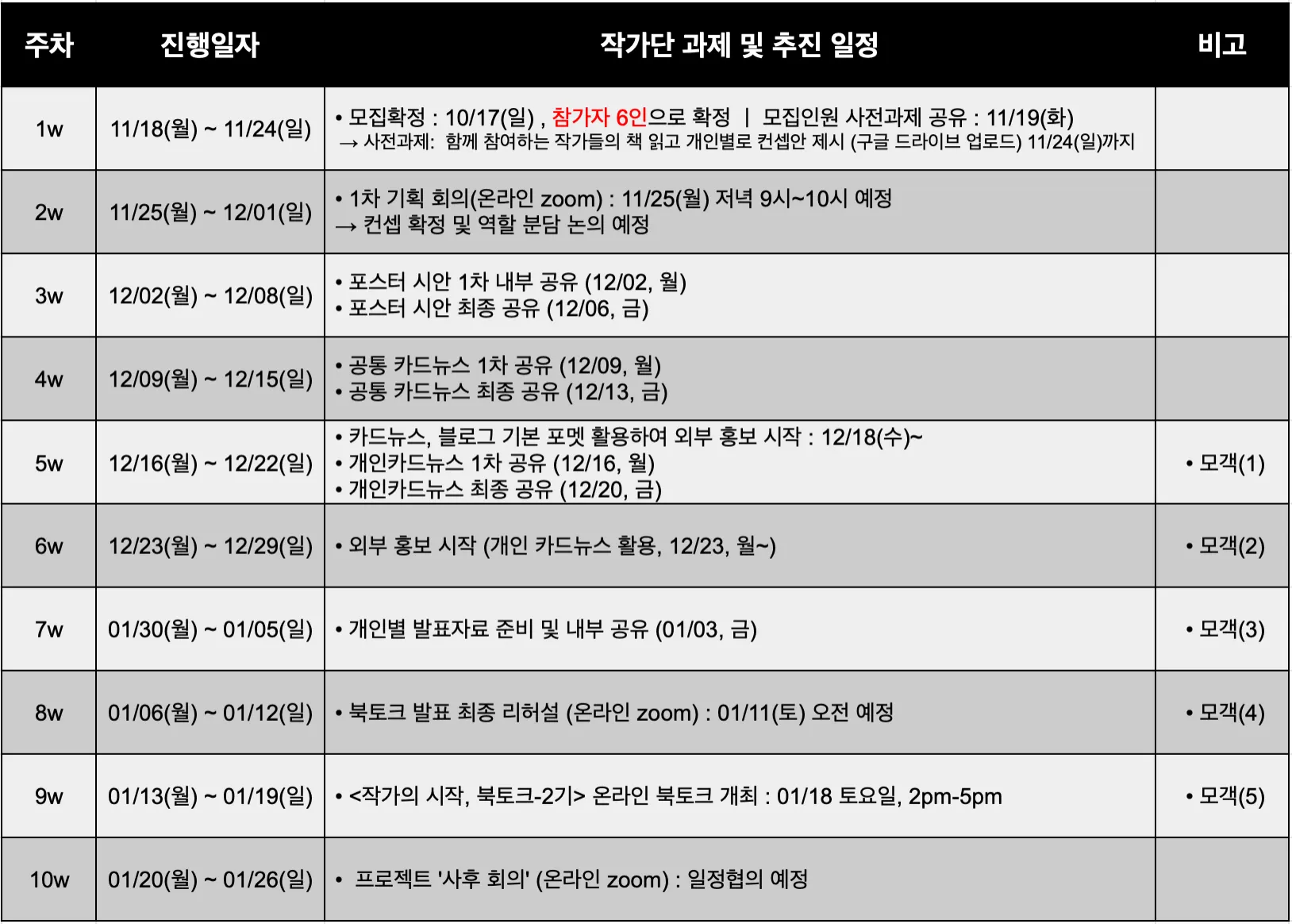 진행 일정 및 과제는 최종 모집되는 작가님들의 국가/지역에 따라서 일부 수정/보완 될 수 있음